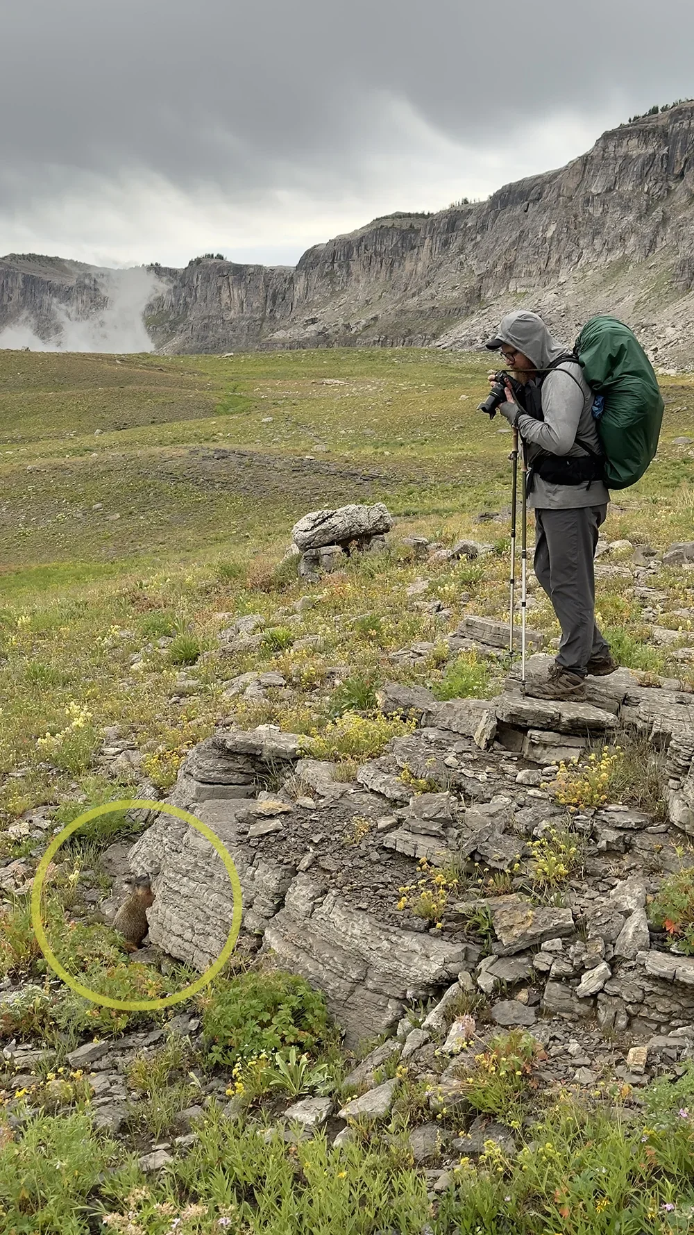 Lots of rodents kept us company that second day and not much else - aside from hours of rain. After about 7 miles of soggy walking, we watched a distressed marmot chirp into the distance, scrambling from rock to rock and looking around. It was kind of obviously looking for something. Suddenly, hearing another marmot, it dashed across a rocky scree field and began chittering and jumping all over the two other marmots it had (apparently) been separated from. It was kind of sweet. Hours earlier, a different marmot had peered over the horizon of a rock as Travis made a portrait of it.